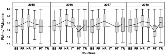 PM2.5 and PM10 have several sources, thus presenting different physical and chemical properties. The study of PM2.5/PM10 ratio is a useful tool to identify PM sources and effects on human health [10,11]. Evolution of the PM2.5/PM10 ratios from 2015 to 2018 is illustrated in Figure 2. Remarkably, the pattern of the ratio in countries is similar to alternate years (2015 and 2017, 2016 and 2018). Even this analysis is absent for Turkey and Italy in 2015 and 2017, respectively, due to the lack of data fulfilling the quality criteria applied in this study; the highest ratios are obtained regularly for Croatia (HR—50% of the ratios were higher than 0.69 in 2016), followed by Italy (IT—with a median of 0.61 in 2016 and 2018), and the lowest ones for Portugal (PT—50% of the ratios were lower than 0.36 in 2016 and 2018) and Spain (ES—with a median of 0.5 in 2015 and 2017). The achieved values are in agreement with others already reported in the literature. For instance, Adães and Pires [9] analysed the PM2.5 concentrations measured at 23 stations distributed in 12 different European cities. Median ratio values were between 0.31 and 0.73 with high values attributed to sites with high traffic influences. Xu et al. [10] analysed the temporal and spatial variability of PM2.5/PM10 ratio. Mean values of 0.62 and 0.68 were determined for urban and background sites, respectively. Munir [11] analysed PM2.5/PM10 ratio at 46 monitoring sites in the UK, where medium values were between 0.4 and 0.8.
