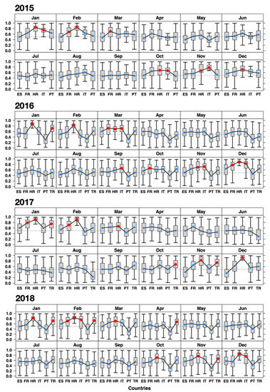 Figure 3 shows, as a more detailed analysis, a monthly analysis of PM2.5/PM10 ratio. Higher values (with median higher than 0.65) are indicated with a red median as a reference in the box-whisker plots. As a general rule, higher ratios are observed in the coldest months (October to February), in particular for countries like Croatia (HR) and Italy (IT). Other countries like France (FR) may show the highest ratios in February. This seasonal pattern is justified by the increase in fuel consumption in this period of the year for domestic and industrial heating [29]. Additionally, the stable atmospheric conditions promote the dry deposition of coarse particles, maintaining the fine particles in the air [10,30]. It can be slightly appreciated that PM2.5/PM10 ratio values higher than the P75 and lower than the P25 are prone to extending to the maximum and minimum ratios, respectively, in the warmest month.