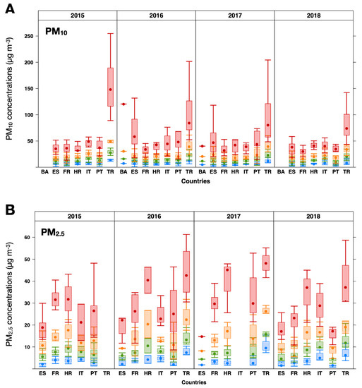 Every PM10 and PM2.5 TS from 2015 to 2018 obtained from the studied countries (Table 1) was analysed independently with HMM to estimate their regimes of concentration. Regimes of monitoring stations by countries are illustrated as box-whisker plots in Figure 4, for PM10 (A) and PM2.5 (B). The first to fourth pollution profiles are shown in blue, green, orange, and red, respectively. To detect the most representative particulate matter concentrations (PM10 and PM2.5), outliers (1.5 times below and higher the 25th and 75th percentile in distributions) were not considered in this study since the aim is to estimate the general trend of PM contributions quantitatively and not isolated outbreaks characterised by the highest concentrations. In Figure 4A, the highest pollution profile (red box-whisker plots) is estimated in Turkey (TR) and Spain (ES), while remaining with similar concentrations for the rest of countries (approximately around 50 µg·m−3), except for Italy (IT) in 2016 and Portugal (PT) in 2016 and 2017. Bosnia and Herzegovina (BA) lacks representativeness regarding its pollution profiles estimation since only one TS from a single monitoring station was available for this country for 2016 and 2017. The rest of the pollution profiles (one to three) remains similar to little variations for all countries.