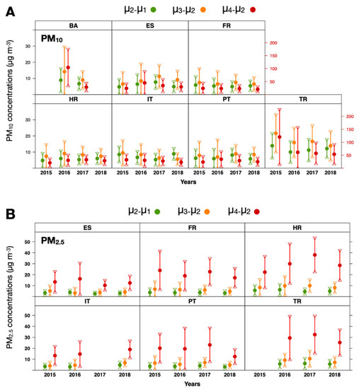 Once pollution profiles were estimated with HMM, PM10 and PM2.5 contributions (African dust contributions to PM10 and PM2.5) according to the regimes’ average values were calculated as defined in Section 2.3. These results are illustrated in Figure 5 for PM10 (A) and PM2.5 (B). Severe dust contributions to PM10 were estimated for Bosnia and Herzegovina (BA), Spain (ES), and Turkey (TR), although this first country lacks representativeness since just TS data from two monitoring sites were studied according to the quality criteria for data coverage used in this study. From 2015 to 2018, average severe contributions (µ4–µ2) were quantified as 66.4 ± 42.8 µg·m−3 (BA), 33.2 ± 25.4 µg·m−3 (ES), 22.5 ± 14.5 µg·m−3 (FR), 28.1 ± 16.7 µg·m−3 (HR), 28.4 ± 17.6 µg·m−3 (IT), 28.1 ± 21.2 µg·m−3 (PT), and 73.1 ± 69.8 µg·m−3 (TR). For the same period, average characteristic concentrations (µ3–µ2) were 11.6 ± 10.3 µg·m−3 (BA), 8.8 ± 7.5 µg·m−3 (ES), 7.0 ± 6.2 µg·m−3 (FR), 8.1 ± 5.9 µg·m−3 (HR), 7.5 ± 5.5 µg·m−3 (IT), 8.1 ± 7.0 µg·m−3 (PT), and 17.0 ± 9.8 µg·m−3 (TR).