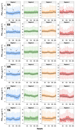 Although the interpretation of these results would require an in-depth assessment of emission sources contributing to air quality at the monitoring stations from which TS were obtained, in Figure 6, it can be noticed that some of the relative fluctuations in concentrations detected in Regime 1 to Regime 3 could be showing some patterns of anthropogenic activity (grey arrows). However, this pattern could be reflected at a different time of the day depending on the location (distance) of the monitoring station with respect to the activities responsible for the emission. This could be the case of the TS from TR, BA, FR, and HR. In these TS, an increase in PM10 concentration can be detected in Regimes 1 and 3 before 12 h and after 18 h. Additionally, this latter activity is detected in the TS from PT. In the case of the TS from ES, this raise in PM10 concentration is detected just after 12 h. This could suggest that although Regime 3 was typically associated with moderate contributions from desert outbreaks (Section 2.3), this regime could also be influenced by contributions from these anthropogenic activities, although to a much lesser extent as evidenced by the magnitude of the fluctuations estimated in this regime. In this regard, another more plausible explanation could be related to the evaporation of semi-volatile organics or semi-volatile inorganic species. This could be similar to the diurnal cycle of the NO3 [39], in which the simultaneous drop in humidity and the rise of temperature causes the evaporation of NH4NO3. The case of PM2.5 in Figure 7 shows similarities with the analysis from Figure 6. Fluctuations around 12 and 18 h can be described for Regimes 1 to 3, being even more evident for the case of PT. In both, either PM10 or PM2.5 analysis, patterns of anthropogenic activity could be partially explained by the location of the stations at low altitude (eight out of ten stations are located below 200 m a.s.l—above sea level; see SM3), and therefore, more likely to be affected by its emission sources.