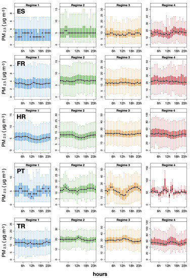 Evolution of the PM2.5 concentration by regimes and hour of the day as in Figure 4.