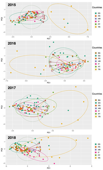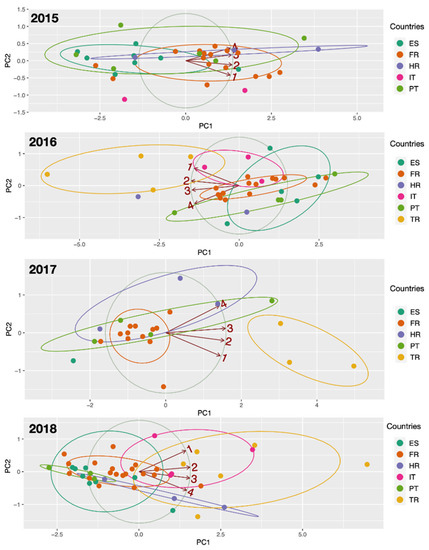 Results of PCA biplot analysis for the different pollution profiles obtained for PM10 and PM2.5 from analysed monitoring stations are illustrated in Figure 8 and Figure 9, respectively. The importance of the principal components is represented as the proportion of variance (in percentage) explained (Table 4). In Figure 8, the confidence ellipses indicate a remarkable grouping of most of the countries during all studied years, except for Turkey (TR—yellow ellipse), due to the higher dust load that this country receives from North African deserts. In particular, for the year 2015, this latter country exhibits a complete dissociation from the rest of the countries in the five studied stations. Monitoring stations from Spain (ES), a country typically suffering from desert particulate matter contributions, show similar behaviour with those from Turkey, since they appear within the TR confidence ellipse. Other monitoring stations showing similar behaviour to those from TR are from Portugal (PT) and Italy (IT), and to a lesser extent, from France (FR), indicated by the ellipse superposition during the studied years. All biplot vectors point to the location of the Turkey ellipse, indicating that these monitoring stations exhibit a higher magnitude than all the PM10 regimes estimated, coinciding with the values from Figure 4A. With respect to PM2.5, the superposition of ellipses is less evident than for the PM10 case, although the distinct role of Turkey remains regarding the magnitude of the estimated regimes (2016 and 2017). In general, PM10 and PM2.5 confidence ellipses show a similar pattern during the studied years, although the PM2.5 analysis for TR in 2015 is not available due to the lack of data.