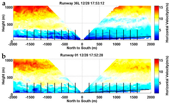 - Zhang, H.; Wang, Q.; Wu, S. Low-Level Wind Shear Observation at Beijing Capital International Airport Based on Coherent Doppler Lidar. J. Atmos. Environ. Opt. 2018, 13, 34. [Google Scholar] [CrossRef]