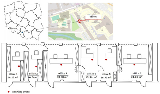 - Kozielska, B.; Brągoszewska, E.; Kaleta, D. Investigation of indoor air quality in offices and residential homes in an urban area of Poland. Air Qual. Atmos. Health 2020, 13, 131–141. [Google Scholar] [CrossRef]