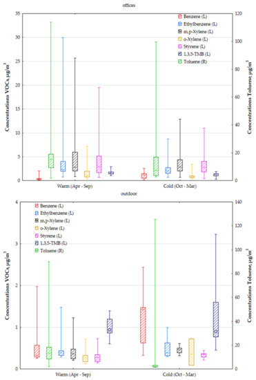 - Delgado-Saborit, J.M.; Aquilina, N.J.; Meddings, C.; Baker, S.; Harrison, R.M. Relationship of personal exposure to volatile organic compounds to home, work and fixed site outdoor concentrations. Sci. Total Environ. 2011, 409, 478–488. [Google Scholar] [CrossRef]