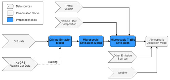 As previously mentioned, the objective of this work is to estimate vehicular traffic pollutant emissions in each segment of a road network by only using macroscopic topographic and traffic information. In the following, the methodology and the main modeling blocks proposed to attain this goal are described in detail. An illustration of the modeling framework is shown in Figure 1.