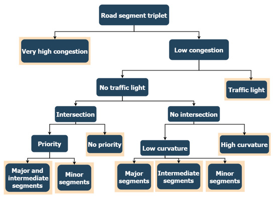 Speed trajectories on the center road links of triplets share the same driving intentions in terms of maneuvers, and thus they have similar shapes and characteristics and a lower statistical dispersion, as observed in real-world driving data. In this second step of the driving behavior modeling approach, a heuristic decision tree is built only from macroscopic road features and traffic conditions (signalization, road curvature, connectivity, traffic congestion, etc.). The decision tree is used to group similar speed characteristics in a same category (a tree leaf in Figure 3). Each category is defined based on chosen macroscopic features that are reported in Table 1.