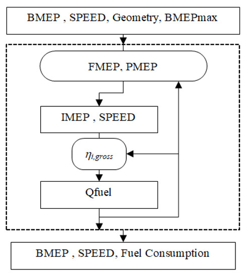 These assumptions are combined in the iterative algorithm presented in Figure 5, and applied for each point of the engine map to determine the pumping mean effective pressure (PMEP), to deduce gross indicated mean effective pressure (IMEP) and fuel consumption, considering the gross indicated efficiency assumption.