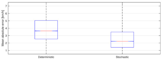 For this comparison, the recorded speed trajectories , and the S parameters are used for the vehicle speed construction. This allows the evaluation of the stochastic and deterministic approaches errors independently from the random forest estimation accuracy. The mean absolute error distribution between the recorded and the constructed speed trajectories in stop cases is presented in Figure 7. The error median is respectively equal to 3.6 km/h and to 2.1 km/h for the deterministic and the stochastic approaches, with an error reduction of around 40% brought by the stochastic approach. The 75th percentile is reduced by 35% with the stochastic approach with an error distribution more concentrated around the median. The error standard deviation is also reduced by 20% with the stochastic approach. The PDF-based construction is more accurate than the deterministic one. It takes complex driving behaviors into account better, especially in the case of a stop over the road link, or for long road links.