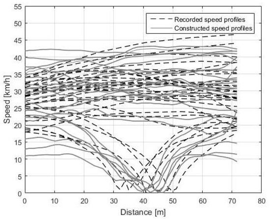 In the first part of the validation analysis, the proposed stochastic speed construction method has been compared to a deterministic one. The deterministic approach is based on constructing speed trajectories between and with first order polynomial functions, the coefficients of which are estimated with the and values. In a stop case, two first order polynomial functions are used, one between and a null speed at S, and the other between the null speed at S and .