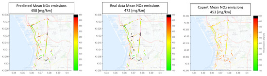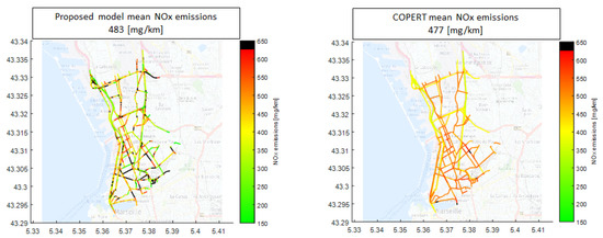 From a qualitative point of view, if we look at the traffic emissions on a map and compare them with the reference emissions (Figure 14), it is possible to see that the proposed models reproduce the true variability of NOx emissions well, as depicted by the reference, while COPERT tends to remain close to the global average by preventing to clearly highlight the critical areas in terms of emissions. Figure 15 illustrates a comparison of maps for vehicle NOx emissions in a neighborhood of Marseilles on all road links. Both COPERT and the proposed models have the same average NOx emissions. However, the proposed model shows more sensitivity: the infrastructure impact on traffic emissions is better taken into account than with the COPERT model.