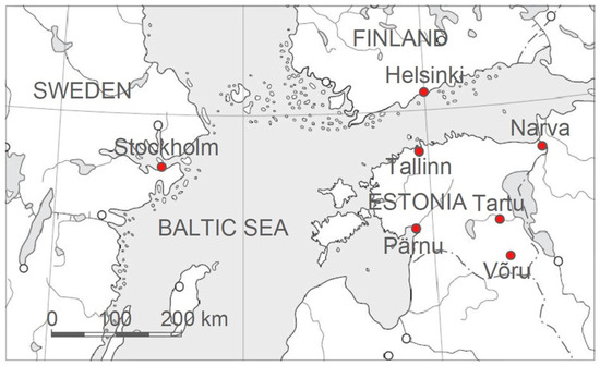 In this study, we aimed to analyze the changes in surface air temperatures and their relationship between cities of the central Baltic area (Tallinn, Narva, Pärnu, Tartu, Võru, Stockholm, and Helsinki) at various time points (daily, monthly, seasonal, and annual) between 2005 and 2019. It is noteworthy that in some cases, the meteorological stations are located outside the city limits in order to eliminate the general thermal effect of the urban environment. For the sake of brevity, hereinafter, we will be using the names of the cities instead of the names of the stations where air temperatures were measured. We selected the area and the specific cities by considering their location in relation to the Baltic Sea and the availability of the long-term results of reliable measurements of air temperature. Figure 1 displays the map of the study area. In the study area, the coastal cities namely, Stockholm, Tallinn, and Narva are located in the west-to-east direction, whereas Helsinki, Tallinn, and Pärnu are located in the north-to-south direction. Tartu and Võru are inland cities located somewhat off the coast of the Baltic Sea. Previous studies show greater differences in the changes in the air temperature of various cities in the area being researched in this study. Tallinn’s location is central in relation to the area being researched; therefore, in many cases, it is reasonable to look for correlation and difference in surface air temperatures in relation to Tallinn’s surface air temperatures.