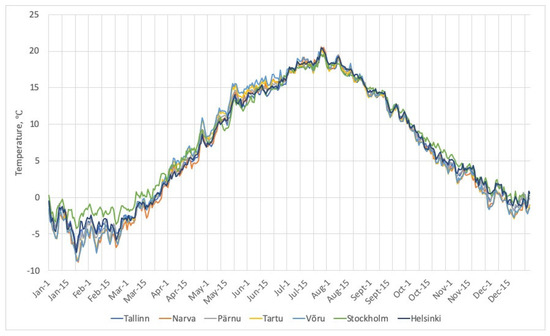 The operation of meteorological stations in Estonia is coordinated by the Estonian Weather Service (EWS), which publishes the results of meteorological observations in its yearbooks; the latest data available are from the year 2019 [45]. The Tallinn meteorological station began its operation in 1805, and since 1946, air temperatures in Tallinn have been measured by the Tallinn–Harku meteorological station. Narva meteorological station has been operating since 1866. Between 2000 and 2013, the station was in Narva–Jõesuu, and at the end of 2013, the station was moved to Soldina village, which is under the municipal administration of Narva–Jõesuu. Pärnu meteorological station began recording measurements in 1842. In Tartu, meteorological measurements have been recorded since 1865, and since 1964, air temperatures for Tartu have been measured by the Tartu–Tõravere meteorological station. Võru meteorological station has been operating since 1868. The data on the daily average surface air temperatures in Tallinn, Narva, Pärnu, Tartu, and Võru for the period from 1 January 2005 to 31 December 2019 (15 years) has been obtained from the Estonian Environment Agency [46].