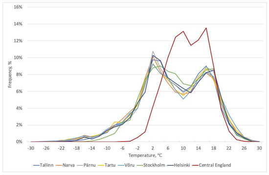 The frequency distribution of the daily mean air temperatures in central England differs from the frequency distribution in the central Baltic area. At higher temperatures, the frequency distribution practically coincides with the frequency distribution of air temperatures in the central Baltic region, but there is a significant difference in the occurrence of lower air temperatures.