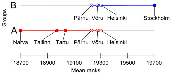 The frequency distribution of the average daily surface air temperatures in the cities of the central Baltic area during the 15-year study period does not correspond to normal distribution, either visually or according to the Jarque–Bera and Smirnov–Kolmogorov tests. Therefore, we used the nonparametric Kruskal–Wallis test to compare the average daily surface air temperatures of the cities. The analysis revealed that the average daily surface air temperatures of all the cities cannot be considered to come from the same data set at the significance level of 0.05 (as the observed value of H (26.75) is higher than the critical value (12.59)), i.e., the surface air temperatures of different cities differ from one another. Using Dunn’s test, we can determine in which cities there is no significant difference between the average daily surface air temperatures during the period 2005–2019. According to the results of Dunn’s test, at the significance level of 0.05, the cities can be divided into two groups (A and B) based on the average daily air temperature, of which Narva (A) and Stockholm (B) differ the most. Figure 4 shows a diagram of the critical differences in surface air temperatures. On the diagram, the cities are ranked according to the mean rank of the variation series. It is interesting to note that three cities (i.e., Pärnu, Võru, and Helsinki) belong to both groups, i.e., their average daily air temperatures do not show a critical difference in the Dunn’s test at the significance level of 0.05 compared to the surface air temperature of any other cities in the central Baltic area.