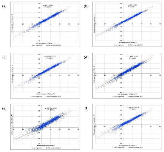 Correlation of average daily air temperatures in different cities with the average daily air temperature in Tallinn during the period 2005–2019 with a linear regression and 95% confidence bounds: (a)—Narva, (b)—Pärnu, (c)—Tartu, (d)—Võru, (e)—Stockholm, and (f)—Helsinki.