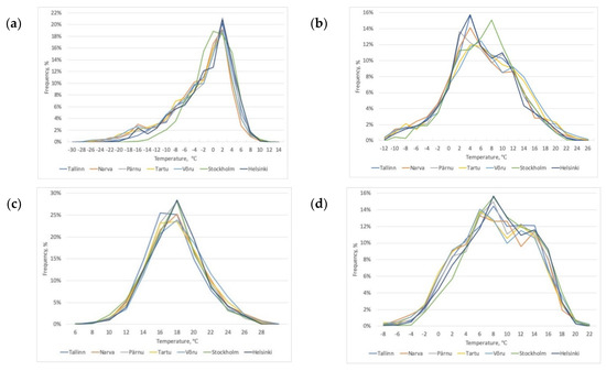 Changes in the average daily surface air temperatures in the cities of the central Baltic area in different seasons are characterized by the frequency distributions that are shown in Figure 6, which demonstrates that the changes in air temperatures are virtually coincident in summer (June to August, 1380 observations in each city). In winter (December to February, 1353 observations in each city), Stockholm stands out due to its more moderate temperatures. The most significant differences are in the frequency distributions of surface air temperatures in spring (March to May, 1380 observations in each city) and autumn (September to November, 1365 observations in each city).
