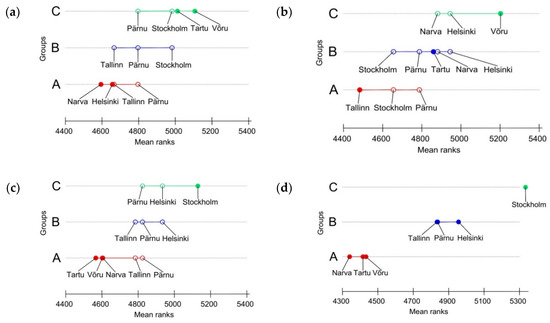 Division of the cities in the central Baltic area into groups on the basis of the critical difference in average daily surface air temperatures according to the Dunn’s test: (a)—spring, (b)—summer, (c)—autumn, and (d)—winter.