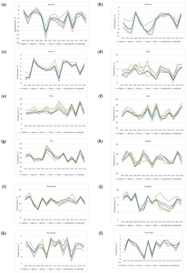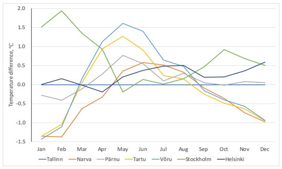 Surface air temperatures changed drastically throughout the year in the different cities. The values were close to each other; therefore, studying the relative difference in surface air temperatures is reasonable. The comparison can be based on the average monthly surface air temperatures in Tallinn due to the city’s central location in the area being studied. Figure 9 shows the difference between the average monthly surface air temperatures in other cities being studied and the average monthly surface air temperature in Tallinn throughout the year.