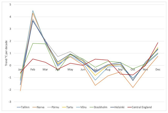 Changes in average monthly surface air temperatures in central England differ significantly from the changes in average monthly air temperatures in the central Baltic area. The monthly average air temperature trends in central England ranged from −0.77 °C per decade to 0.54 °C per decade, except in December where the average monthly air temperature increased by 1.88 °C per decade (Figure 11).