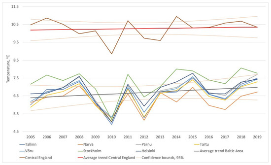 Trends of average monthly surface air temperatures from 2005 to 2019 in the different cities of the central Baltic area and in central England.