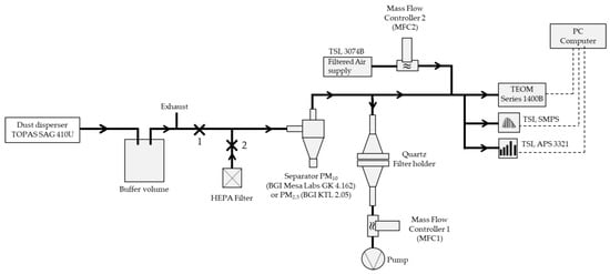 After its generation, the aerosol is routed to a buffer volume, thus making it less dependent on a variation in mass during generation. The aerosol then reaches the PM10 or PM2.5 separator with a cut-off diameter d50 at 10 μm for 3.0 L min−1 and 2.5 µm for 4.0 L min−1, respectively, and described elsewhere []. During loading on a filter, clip 2 is installed, and clip 1 is removed. The aerosol is then routed to a Tapered Element Oscillating Microbalance (TEOM 1400A, Rupprecht & Patashnick, Waltham, MA, USA, with an aerosol flow rate at 3.0 L min−1) [] to monitor the particulate mass concentration. During a filter loading with a PM10 separator, we stop the filter pump when the Total Mass measured by the TEOM reaches the value of 500 µg. This value led to an approximate mass of 2.5 mg on a filter. For the PM2.5 separator, which needs a flow rate of 4.0 L min−1, we keep a five times higher mass load of the quartz filter with a modification of the flow rate setpoint for MFC1 and MFC2 (Figure 1). This experimental approach enabled us to avoid a filter with a mass that deviates from the target value of 2.5 mg.