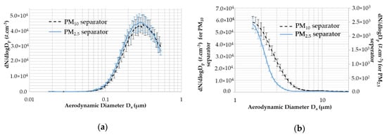 Figure 2 presents the SMPS and APS size distributions between 0.01 µm and 16 µm for the PM10 and PM2.5 separators. Figure 2a presents the SMPS size distribution with data acquisition for 20 min, which corresponded to one filter-loading duration. The standard deviation shows that a good generation stability during filter loading concerning the number and modal size was achieved. A median size diameter equal to Dmedian = 280.1 nm ± 2.0 nm and Dmedian = 270.9 nm ± 1.9 nm was obtained for the PM10 and PM2.5 separators, respectively. It is showed that we have small differences between PM10 and PM2.5 experimental for SMPS measurements.
