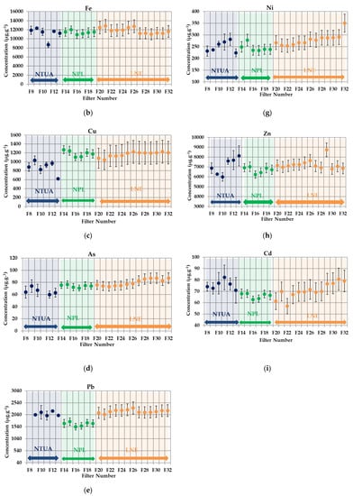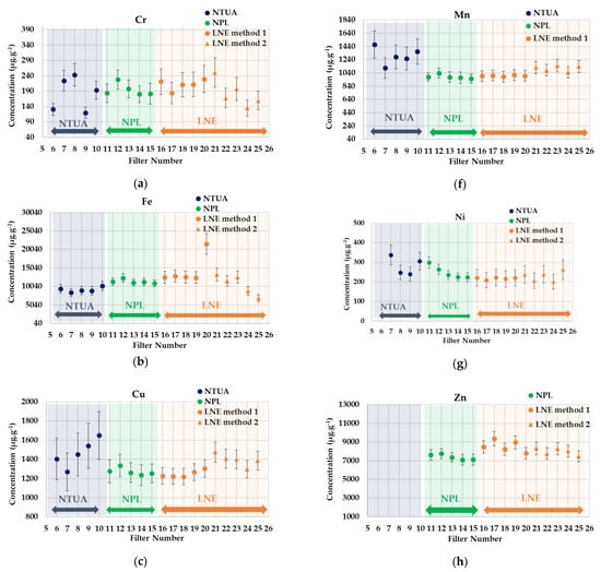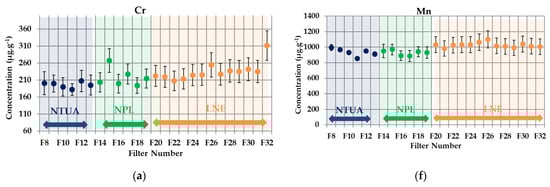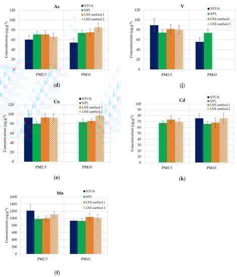 The mean value of the mass concentrations of V, Cr, Mn, Fe, Cu, Ni, Zn, As, Cd, Co and Pb (expressed as the average value divided by mass deposited on filters and expanded uncertainties) for PM2.5 and PM10 are reported. Figure 5a–k illustrates the data for each element.