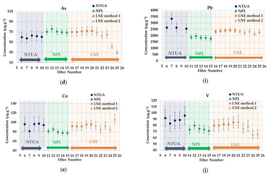 The global RSD for all metals are below 20% (see Appendix B). Especially for Mn, Fe, Ni, Zn and Cd, the RSD values are below 10%. These results show that a good reproducibility of filters loading was achieved. In Figure 4a–j, the PM2.5 mass concentrations of the metals divided by mass deposited on the filters and the uncertainties provided by each partner are plotted. The filter blank subtraction is included.