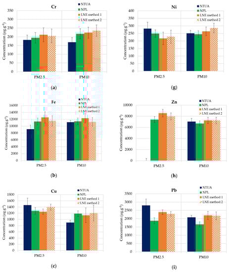 Inductively Coupled Plasma–Mass Spectrometry (ICP-MS) intercomparison results for particulate matter PM10-loaded filters. (a) Cr, (b) Fe, (c) Cu, (d) As, (e) Pb, (f) Mn, (g) Ni, (h) Zn and (i) Cd.