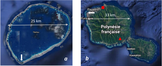 (a) Tikehau atoll in the Tuamotu Archipelago (French Polynesia). The white arrow indicates the airport of Tuherahera. (b) Tahiti Island in the Society Islands. The white arrow indicates the University site (Outumaoro, municipality of Punaauia, French Polynesia). Water catchment points from spring water: Eau Royale ■, Vaimato ▲). Source: Google Earth.