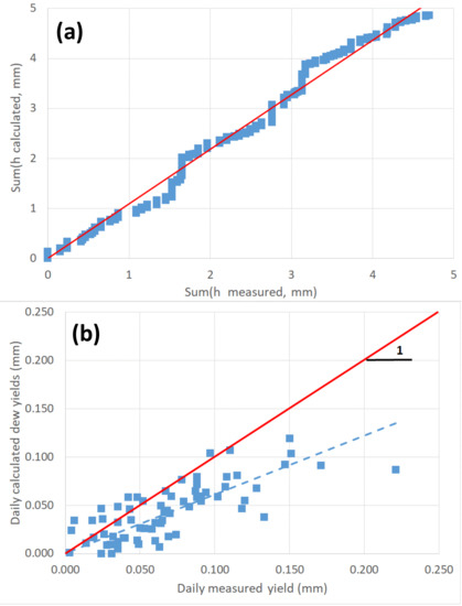 (a) Cumulative daily dew yields (calculated vs. measured) on a 6 month dry period in 2005 at Tahiti according to the energy balance model [33]. (b) Daily dew yields on the studied period (calculated vs. measured). The interrupted line (blue) is a linear fit (slope = 0.611 with R2 = 0.549) and the full line (red) corresponds to Y = X.