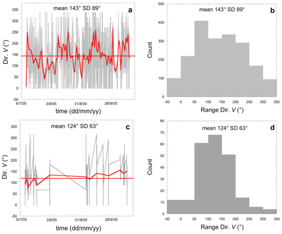 Evolution of the wind speed direction Dir. V (°) (a,c) and histogram (b,d) at Tahiti airport 2.5 km from the sampling site (10 July–14 October 2005). (a,b) During day and night and (c,d) during dew sampling nights. Mean values with standard deviation SD are given. The bold line is the mean, and the bold curve is a smoothing function.