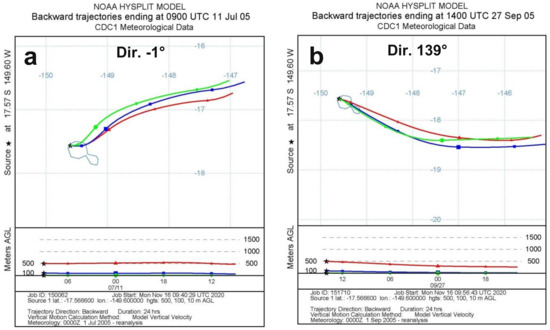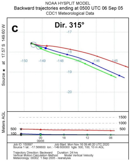 Backward 24 h evolution of air masses at 10 m (green curve, circles), 100 m (blue curve, squares) and 500 m (red curve, triangles) above the ground level corresponding to (a) minimum night wind direction (−1°) on 11/7/2005 09:00 UTC (10/7/2005 23:00 TAH time), (b) mean night wind direction (139°) on 27/9/2005 14:00 UTC (27/9/2005 04:00 TAH time) and (c) maximum night wind direction (315°) on 6/9/2005 05:00 UTC (5/9/2005 19:00 TAH time). (a,c) directions are due to transitory local variations. (From NOAA’s HYSPLIT model [37,38]).