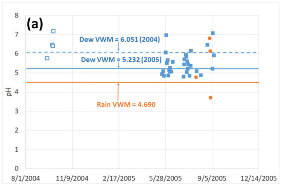 Figure 5a shows the pH evolution for rain and dew. As anticipated, there is no clear variation in time due to the stability of the meteorological conditions. Rain at the TAH site (Table 3) appears slightly more acidic than dew with VWM = 4.690 (min value = 3.67; max value = 6.77; arithmetic mean: ), nearly half a unit less than dew pH). For TKH (Table 4), the VWM = 6.44 (min = 6.29; max = 6.55; arithmetic mean: ). As usual [2,41], dew pH is less acidic than rain because dew reacts with more deposited aerosols (e.g., CaCO3) than rain. We note that dew samples are more acidic than the “Vaimato” and “Eau Royale” local spring waters (pHVaimato = 7.65 and pHEau_Royale = 7.9). The WHO drinking standards recommend 6.5 < pH < 9.5 [39], dew and rainwater pH are thus somewhat below the lower recommended value.