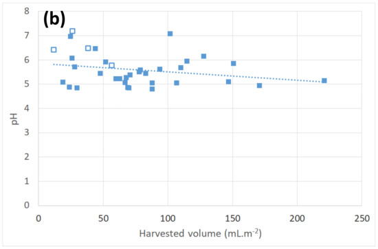 Figure 5b presents the pH variation with respect to the daily harvested volume V at TAH (gravity flow plus scrapping). Note the decrease of one pH unity (pH = six to pH = five) for dew with volume from 12 to 221 mL·m−2. The data are fitted with the linear law pH = a·V + b with and (uncertainty: one standard deviation). This tendency to have lower pH with higher water volume corresponds to a lower concentration of reacting aerosols in water and is generally observed (see [2,41]).