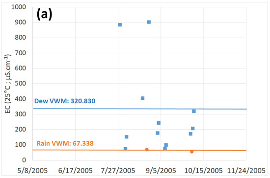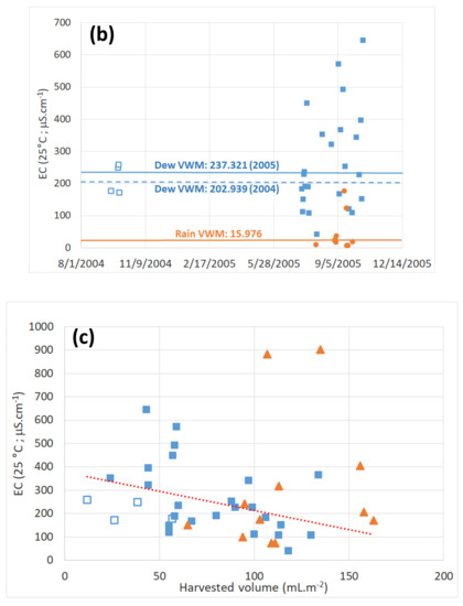 Figure 6a,b reports the EC evolution for rain and dew. As already noted in Section 4, the constancy of measurements is due to the stability of the meteorological conditions governed by the trade winds. Figure 6c reports the correlation of dew and rain ECs in relation to the total harvested volume V (scrapped and obtained by gravity). We obtain a classical dilution-governed evolution (see [2]), with a decrease in dew EC with the increase in V.