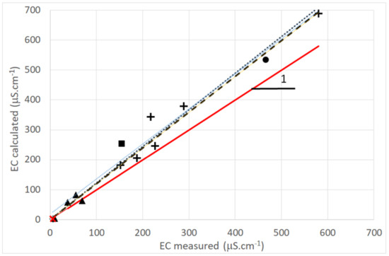 Figure 7 reports the measured (σm) and calculated (σc) electrical conductivity for water samples (dew and rain, blank, and spring waters). As can be seen in Figure 7, σm is proportional to σc for dew and rainwater. With σm = aσc, a (dew) = 1.224 0.055 with R2 = 0.979 and a (rain) = 1.197 0.17 with R2 = 0.884 (all uncertainties are one standard deviation). The value a > 1 is correlated with the 17% difference of the ionic balance and shows that some anions are not taken into account (presumably organic acids, which are not measured). This difference is, however, below 20%, and should be acceptable according to WMO [49], meaning that the measured ions are indeed dominant in the EC determination. One notes that the EC mean values for dew and rain (TAH and TKH) respect the indicator criteria for drinkable water according to WHO (EC < 2500 μS·cm−1 [39]).