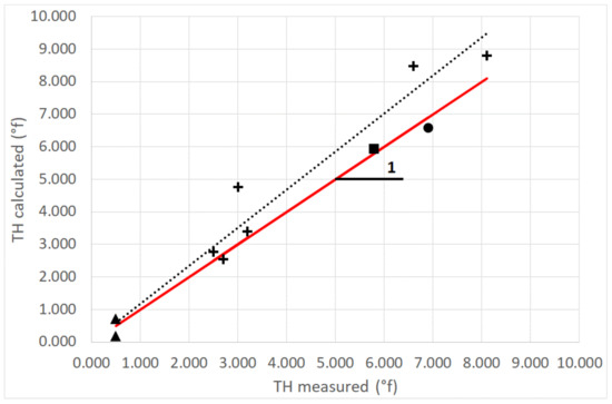 Table 3 and Table 4 present the calculated TH (°f) for all samples. These values are compared with the measured TH in dew and rain and spring waters (Figure 8). A linear fit for dew data leads to TH (calculated) = (1.17 ± 0.067) TH (measured) with R2 = 0.968 (uncertainty: one standard deviation).