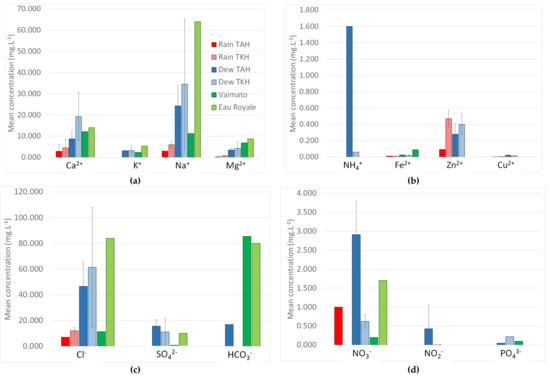 Mean concentration (mg·L−1) of cations (major (a) and minor (b) ions) and anions (major (c) and minor (d)) compared to both Polynesian spring waters (“Vaimato” and “Eau Royale”). Standard deviations have been added for only dew and rain samples. (2005 data).