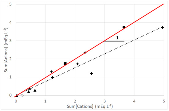 The ionic balance has been determined to verify the quality of the chemical analysis. Based on each ionic concentration, the sum of cations (volume weighted) is compared to the sum of anions (volume weighted) in order to test electro-neutrality for dew, rain, blank and spring water samples (Figure 10). We can conclude that a good correlation is found for all samples where (R2 = 0.909) (uncertainty: one standard deviation) and for dew samples where (R2 = 0.921) (uncertainty: one standard deviation). A first group integrates all dew samples with equivalent concentrations ranging from one to five mEq·L−1 including, on the same scale, both spring waters (“Vaimato” and “Eau Royale”, about 1.7 and 4 mEq·L−1, respectively). A second group is concerned with the rain samples with small ion balance values (about 0.5 mEq·L−1). According to WMO [49], the acceptable difference for concentrations > 0.5 mEq/L is 10%. Then, the ratio between the sum of cations and sum of anions, which presents 17% imbalance, shows that some anions are not taken into account. These ions are presumably organic acids, which were not measured.