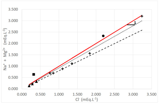 As expected, one can conclude that Na+, Mg2+ and Cl− are clearly of sea origin (dew and rain). This result can be correlated with the plot between {[Na+] + [Mg2+]} versus [Cl−] presented in Figure 11. It exhibits a linear correlation Y = aX between the sum of both Na+ and Mg2+ concentrations (mEq·L−1) versus Cl− (mEq·L−1). For dew samples, a = 0.899 ± 0.032 with R2 = 0.974 (uncertainty: one standard deviation) and for rain samples, a = 0.799 ± 0.027 with R2 = 0.996 (uncertainty: one standard deviation).