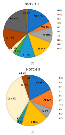 As a result of analyzing detailed metal components for each notch, Fe occupied 20% at 1 notch, showing the highest ratio, and it was identified in the order of Na and Ca, and in notch 5, it was found that Ca occupied the highest percentage with 35%, and it was confirmed in the order of S and Na. Lastly, in notch 8, Ca occupied more than half of the total ration with 60%, and was identified in the order of S and Na, showing a similar tendency of notch 5 (Figure 8).