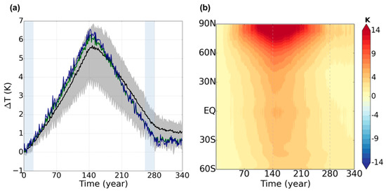 Figure 1a shows the global mean surface air temperature (GSAT) response over the entire simulation period relative to the average PI level. The GSAT increases with rising atmospheric CO2 and reaches a peak of approximately 5.4 K (130–150 years) above the PI level. As the CO2 concentration decreases, the GSAT change also quickly decreases. However, the rate of decrease is −0.03 K year−1, which is slower than the increasing rate (−0.04 K year−1). When the CO2 concentration returns to the PI level, the GSAT change value remains approximately 1.5 K above its initial value. This result is similar to those of previous studies [17,20,31]. Figure 1b shows the latitudinal temperature change rates (K). Temperature changes are similarly reversed within the timescale of CO2 reversal and all the latitudes remain at a warming temperature of more than the PI level after 280 years. In particular, at the northern higher latitudes, the largest percentage change occurs at above 60° N. In mid-latitudes (30–60° N), the temperature changes are larger than other latitudes (except for the northern high latitude). This indicates that the peak temperature changes of EA and KO are larger than the GSAT response (Figure 1a). Therefore, the increasing and decreasing rate of temperature in EA and KO are higher than those in GSAT (Figure 1a). The peak temperature changes (130–150 years) of EA and KO are 5.9 K and 6.1 K, respectively. In addition, the temperature changes remain at 0.91 K (EA) and 0.84 K (KO) in the P2 period, and these values are smaller than the GSAT response. This demonstrates that even if the atmospheric CO2 reduces, the reversibility of global and regional climate is different.