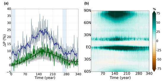 (a) Time series of the response for mean precipitation to the CO2 ramp-up and ramp-down relative to PI levels from the CMIP6 models. Black, green, and blue lines show global, EA, and KO, respectively, and gray shadings indicate the spread of CMIP6 models. Navy line indicates moving 10-year averaged in KO. The vertical shading indicates the first 20 years (P1) and last 20 years (P2). (b) The time–latitude diagram of the global mean precipitation changes (%) relative to PI level.