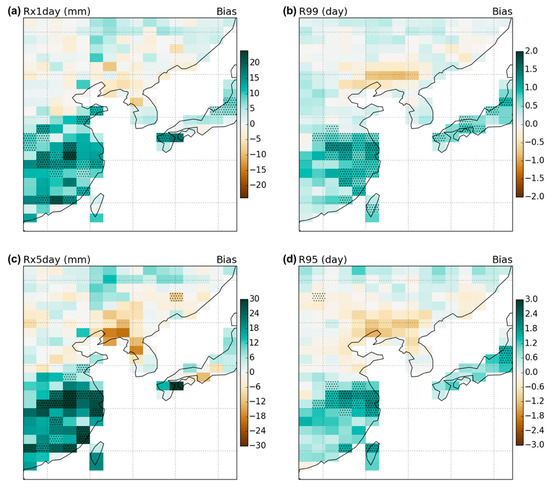 Spatial distribution of difference (P2–P1) for (a) R×1day, (b) R99, (c) R×5day, and (d) R95 from CMIP6 multi-model ensemble mean in the EA region.