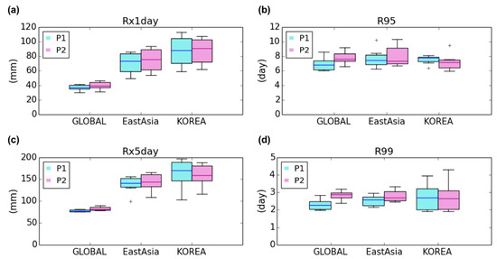 Box plots for (a) R×1day, (b) R99, (c) R×5day, and (d) R95 calculated from the CMIP6 models in the global, EA, and KO region. The boxes indicate the interquartile model spread (range between the 25th and 75th percentiles) and blue and pink indicate the P1 and P2 periods, respectively.