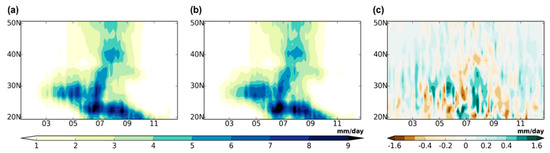 The time–latitude Hovmöller diagram shows the seasonal monsoon rainband over the EA region (Figure 5). This cross-section analysis is a useful tool to assess the inter-seasonal variation in the EASM and associated monsoon characteristics (onset and withdrawal time) [34]. In the spring, the rainband occurs in association with around 30° N latitude, although the precipitation amount is smaller than that in the summer (Figure 5a,b). Following the enhancement of the frontal system associated with moisture support, the rainband shows seasonal movement northward. Similarly, several previous studies report that the EASM propagates northward, beginning in mid-May in the South China Sea and in late June in Korea [30,35,36,37,38,39,40]. The latitudinal rainband around 30° N in the P2 period appears more northward than that in the P1 period (Figure 5c). By contrast, in the summer, dry and wet signals appear around 40° N and south of 30° N, respectively. The larger precipitation amount occurs south of 30° N due to the simulated rainband location shifted southward. Following this, the dry signal directly appears after summer, which means that the rainband is located south of 20° N. These results show that the monsoon rainband is shifted southward and seasonal severe droughts may appear in the KO region.