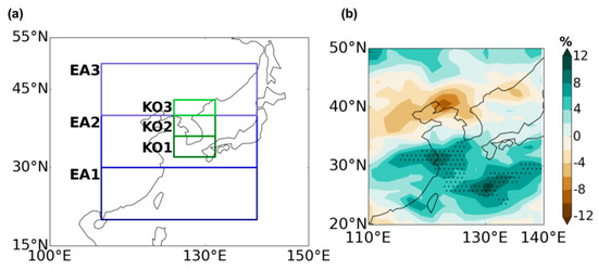 (a) The analysis domains including sub-regions are demarcated by the box in blue (East Asia) and green (Korea) series. (b) Changes in precipitation anomaly as a percentage relative to PI levels for the difference between P2 and P1. Black dot indicates the region that passes the 95% significance.